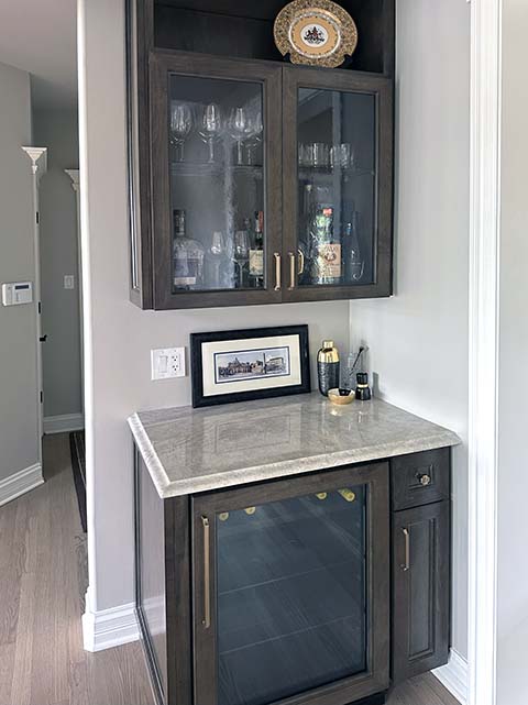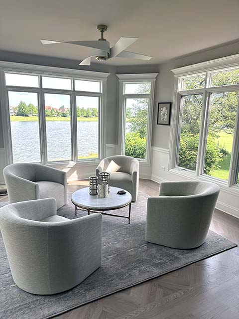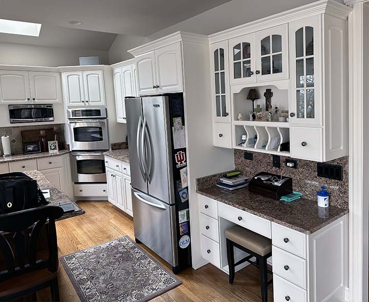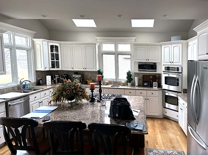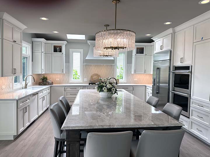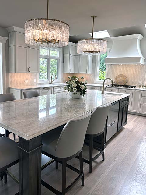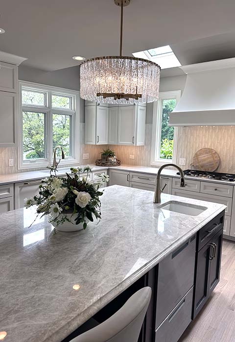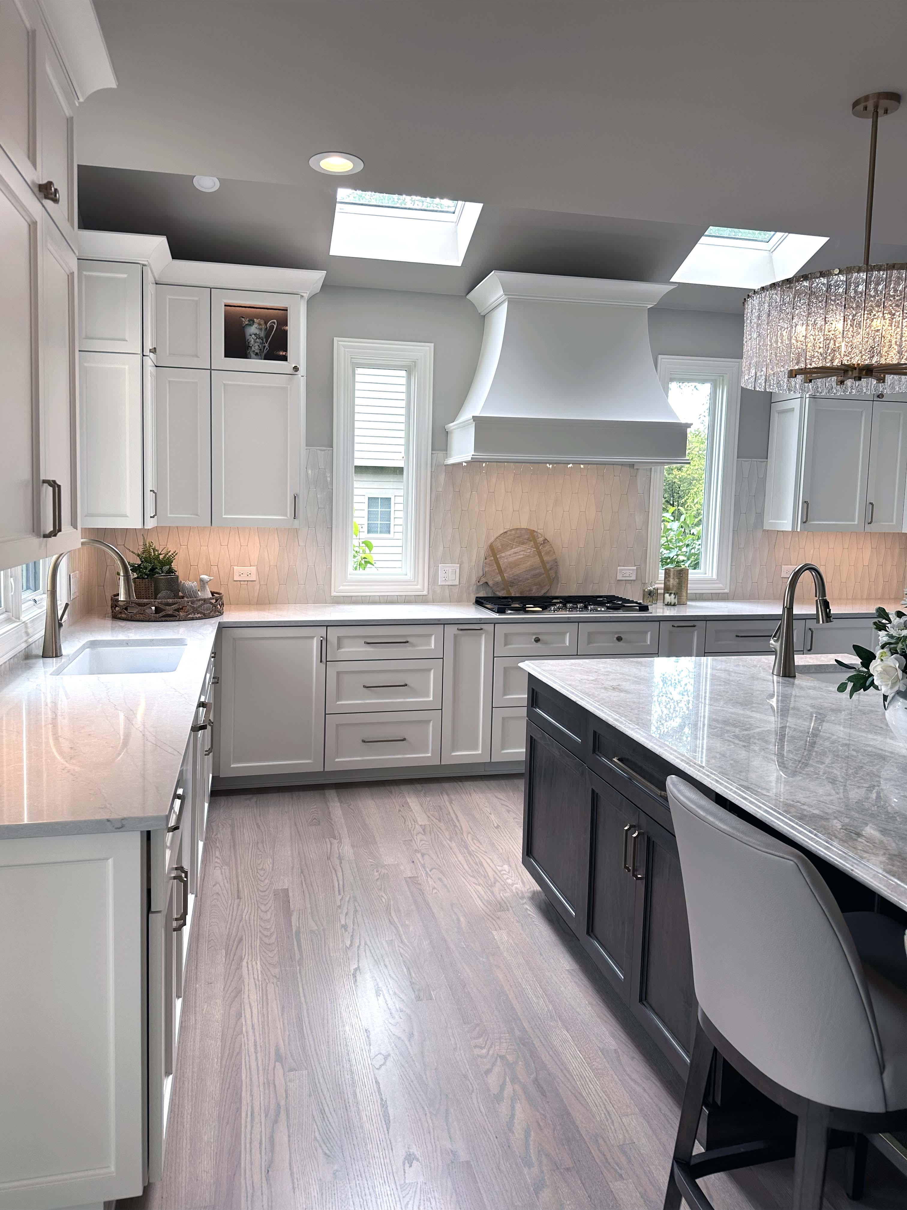 For a client seeking a white and bright aesthetic, this beautiful kitchen renovation delivers both elegance and functionality. The cooktop was relocated from the island to a terminating wall, now showcasing a custom bell hood framed by two new windows that flood the space with natural light. Crisp white cabinetry and a stunning Taj Mahal quartzite island complete this airy, sophisticated transformation.